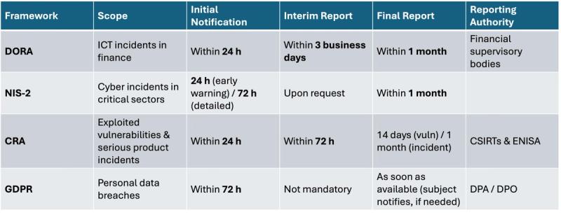 Finally, I would like to advise you to build a streamline multi-regulation (NIS2 / DORA + CRA + GDPR) incident reporting pipeline that handles all EU regulations & directives where incidents have to be done quickly and swiftly to be compliant. More info in this LinkedIn post.